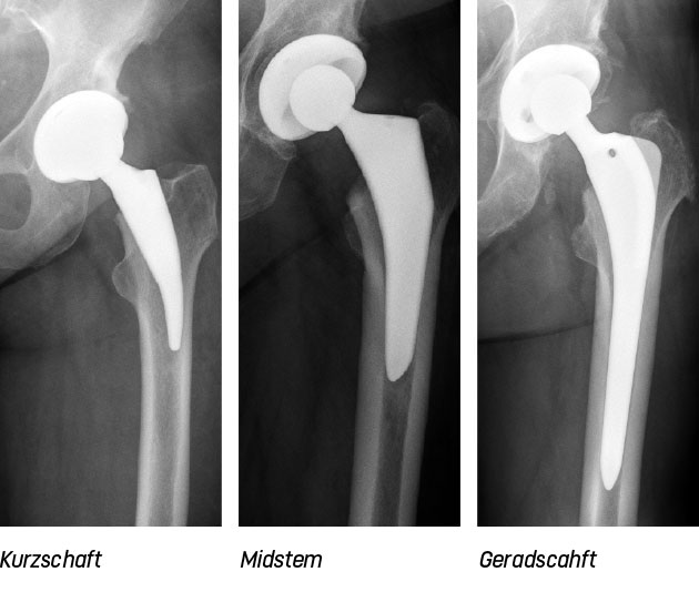 Die Kunst hierbei ist es, diese Besonderheiten zu erkennen und durch die Auswahl des richtigen Implantats diese Anatomie wieder zu rekonstruieren. Zur Verfügung stehen moderne Implantate: Kurzschäfte, Midstems und Geradschäfte (Bild). Auch innerhalb dieser Prothesentypen gibt es vielfältige Variationen in Länge, Breite und Winkel. Ebenso bedingen Knochenqualität und Aktivitätsgrad des Patienten die Prothesenverankerung: Zementiert oder zementfrei.