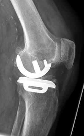 - Röntgenaufnahmen zur Kontrolle des operierten Kniegelenks zeigen eine unverändert regelgerechte Position der Teilprothese (Abb. 7a und 7b)